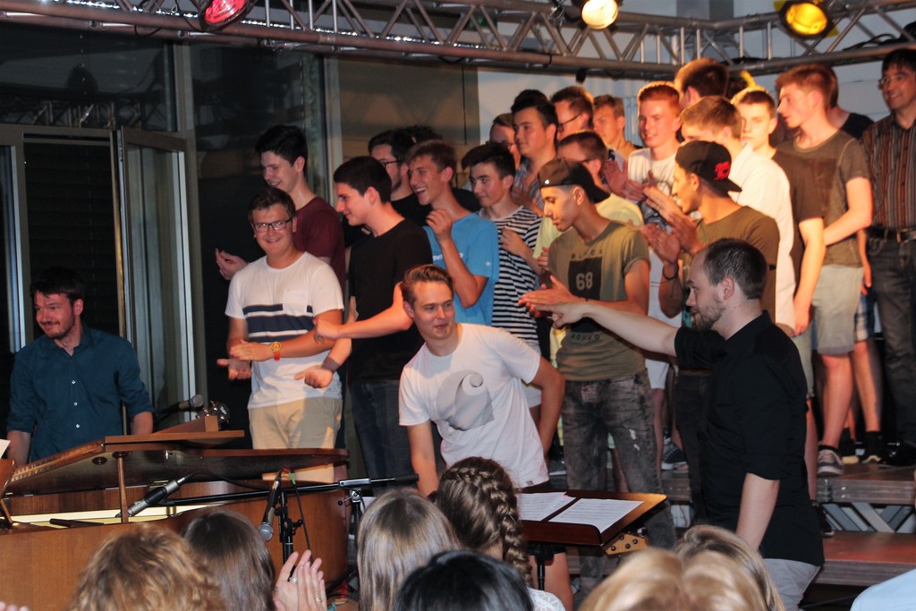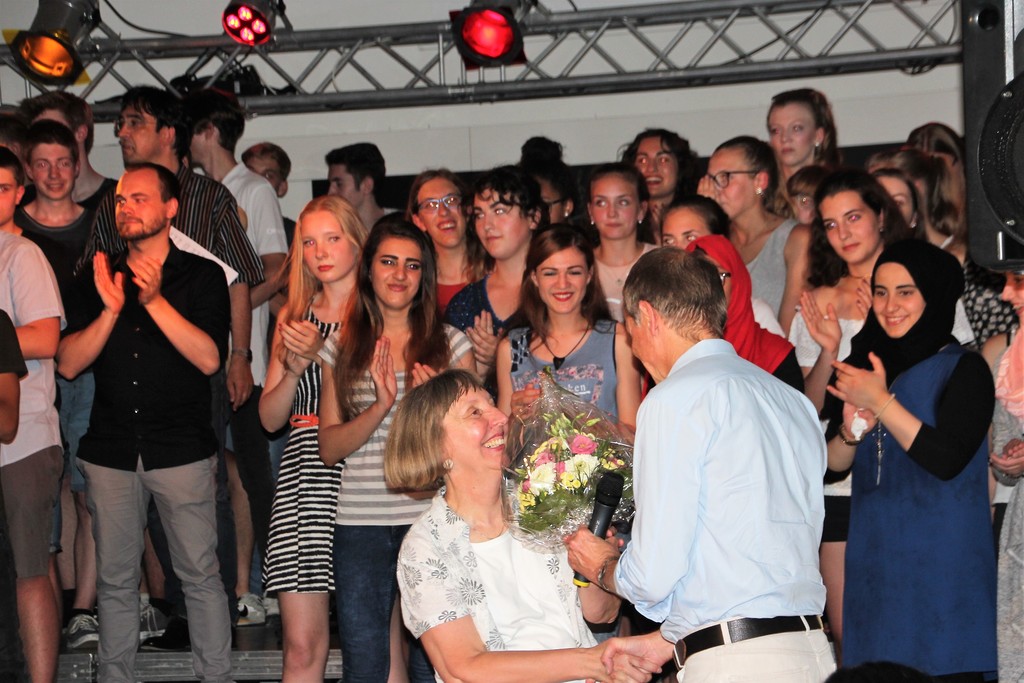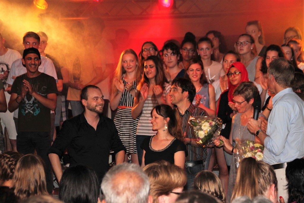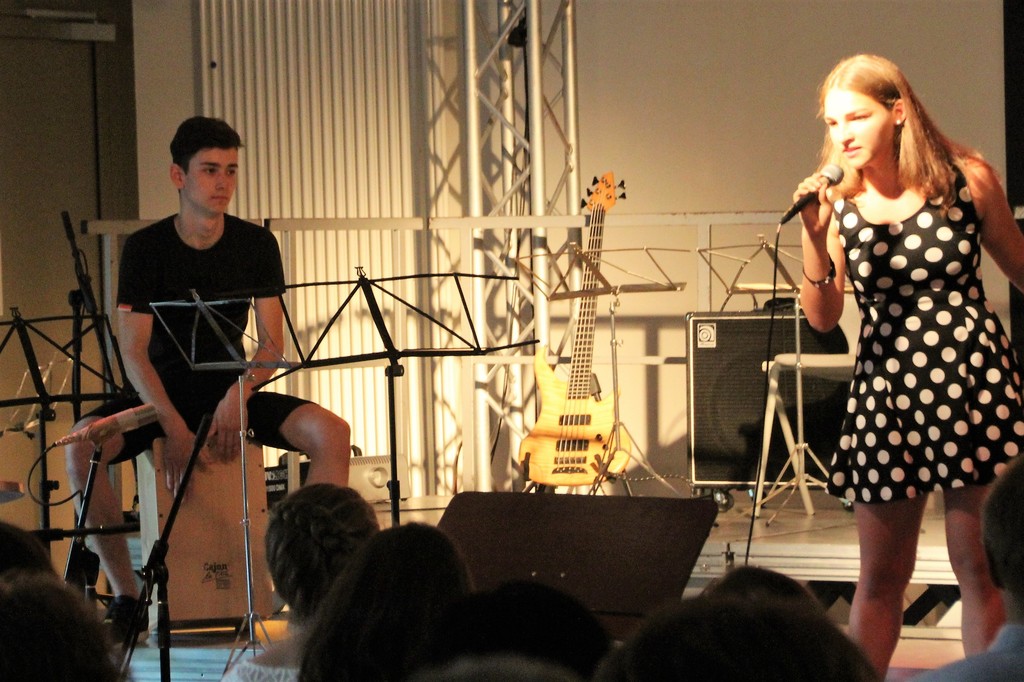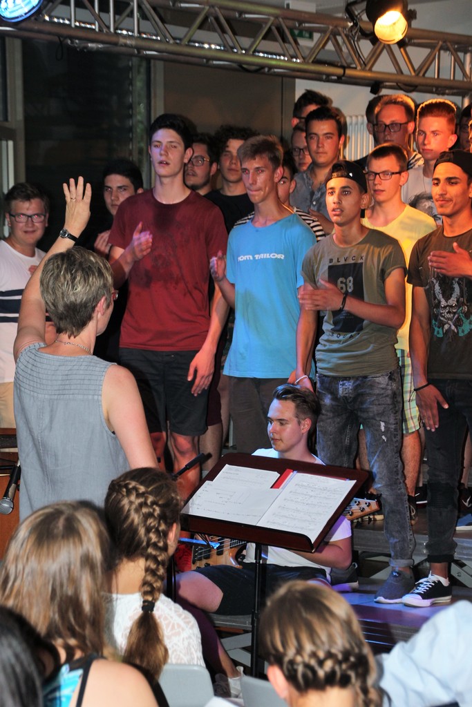 Unter der Leitung aller Musikkollegen kam es dann mit den Musikkursen der Jahrgangsstufen 1 und 2 zu einem wahrhaft heißen Finale: Gemeinsam mit Schülern aus unserer Vorbereitungsklasse für Flüchtlinge brachten die Oberstufenschüler echte „powerfull beats“ und viel „rhythm of life“ zum Ausdruck. Ein internationales Erlebnis war schließlich die Aufführung eines libanesischen Pop-Songs, den die Schüler der VKL ausgewählt hatten. Denn: Susanne Bär wollte den Schülern aus der Flüchtlingsklasse auch einmal die Möglichkeit geben, den Gymnasiasten ihre orientalischen Wurzeln näherzubringen. Das hieß aber auch, dass „wir anderen einmal mit ganz neuen, fremdartigen Melodien und Texten umgehen mussten“, so die Musiklehrerin. Sie gab auch zu, dass vor allem das Erlernen der arabischen Worte manchmal fast aussichtslos erschien: Aber am Ende war „El helwa di“ wirklich der gesungene Wunsch für einen fröhlichen Tag und brachte die Stimmung des Sommerkonzerts zu ihrem Höhepunkt.