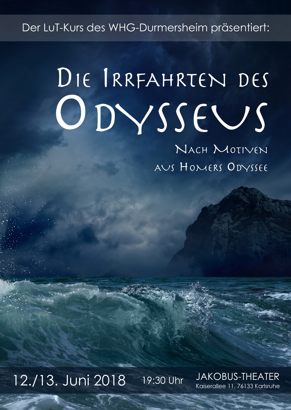 Der "Literatur und Theater“-Kurs der Jahrgangsstufe 1 des Wilhelm-Hausenstein-Gymnasiums Durmersheim präsentiert nun seine ganz eigene Version der „Irrfahrten des Odysseus“ am 12. und 13. Juni 2018 um jeweils 19:30 auf der Bühne des Jakobus-Theater im Theaterhaus Karlsruhe. In einzelnen Gruppen wurden Teile von Odysseus Reise von den Schülerinnen und Schülern selbstständig erarbeitet und nach einem der Schwerpunkte Hörspiel, Ballett, schwarzes Theater, Schattentheater und Musical inszeniert. Die Zuschauerinnen und Zuschauer erwartet ein abwechslungsreicher, oft unterhaltsamer, aber zuweilen auch zum Nachdenken anregender Theaterabend. Der Eintritt ist frei, der "Literatur und Theater“-Kurs freut sich aber über eine Spende für die weitere Theaterarbeit am WHG Durmersheim.