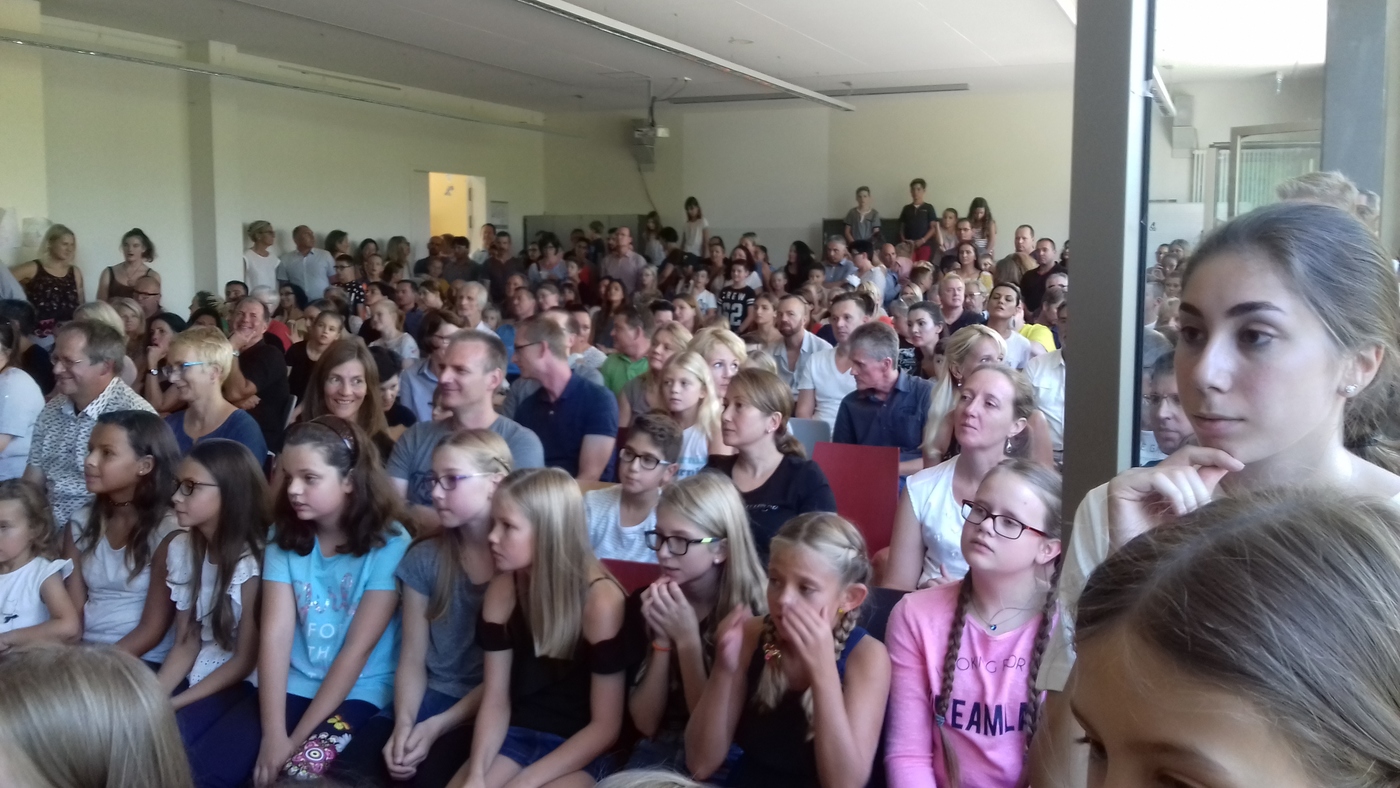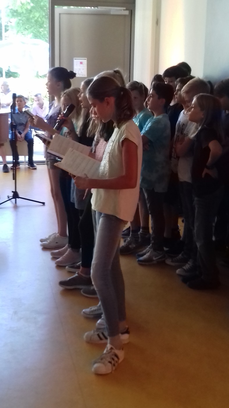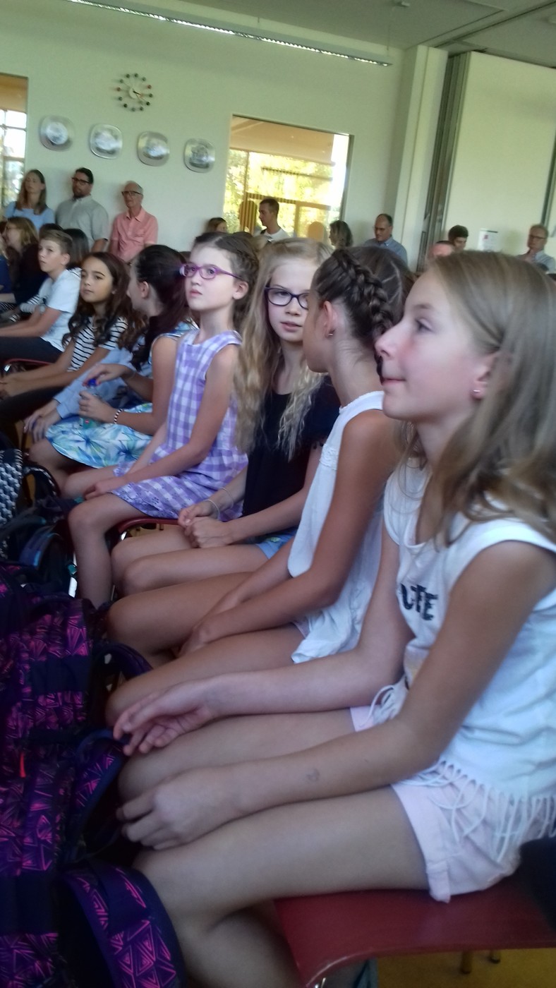 Eine berührende Soloversion von „Somewhere over the rainbow“ sangen danach einige Schülerinnen der 6c und nach einem weiteren Liedvortrag der gesamten Klasse 6b stellte Direktor Dornblüth noch Frau Ernstberger vom Sekretariat des WHG und den Hausmeister Herrn Eckert vor. Dann kam der spannendste Teil für die 103 Fünftklässler: Die Klassenlehrerteams traten nach vorne und hießen nach und nach „ihre“ neuen Schüler willkommen. Sonja Arbogast und Ralf Lehnert begrüßten die 5a, Julia Makowiecki und Alexandra Casper die 5b, Linda Besenfelder und Dominik Sagorski die 5c und Tanja Binge und Susanne Kiefl ihre Klasse 5d.