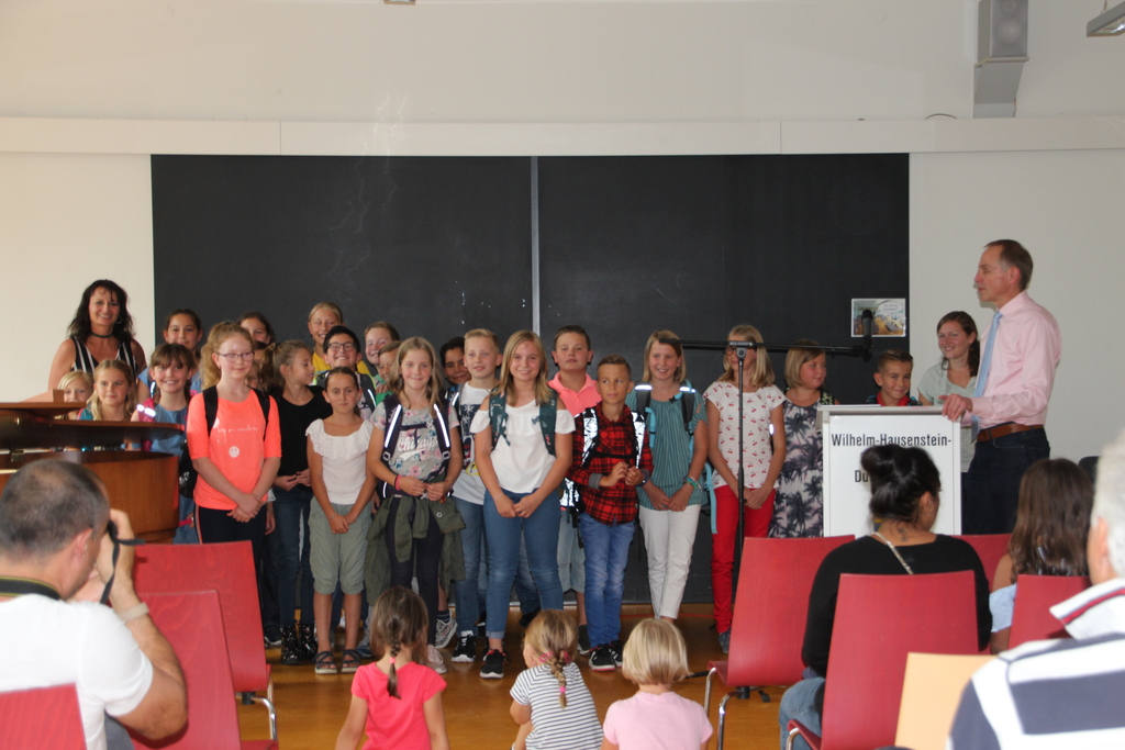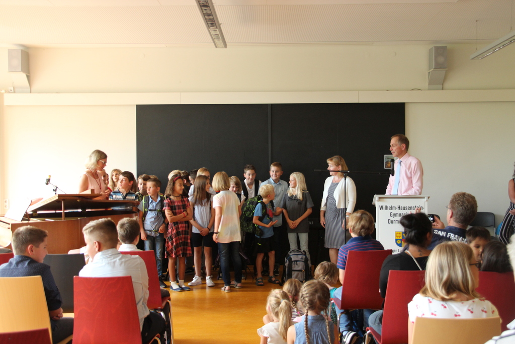 Die Mensa war rappelvoll, als am Mittwoch den 11.9. die Einschulungsfeier der neuen Fünftklässler stattfand. Nachdem die Klasse 6a unter der Leitung von Eva Niess zwei lebhafte Gesangsstücke mit passenden Bewegungen aufgeführt hatte, ergriff Schulleiter Thomas Dornblüth gleich das Wort und begrüßte die 101 neuen Schüler und deren Familien am WHG. Er hätte doch bei der Tanznummer mitmachen sollen, meinte er, denn dann hätten alle etwas zu lachen gehabt. Zu dieser humorvollen Anmerkung passte der Auszug aus dem Jugendbuch „Die fabelhafte Miss Braitwhistle“, in dem erzählt wird, wie die etwas seltsame englische Austauschlehrerin Miss Braitwhistle zunächst skeptisch von einer chaotischen Klasse empfangen wird. Doch spätestens, als die Schüler auf fliegenden Stühlen durch die Schulgänge und den Park reiten, ist für sie klar: Die neue Lehrerin ist doch toll und Schule kann auch sehr viel Spaß machen!