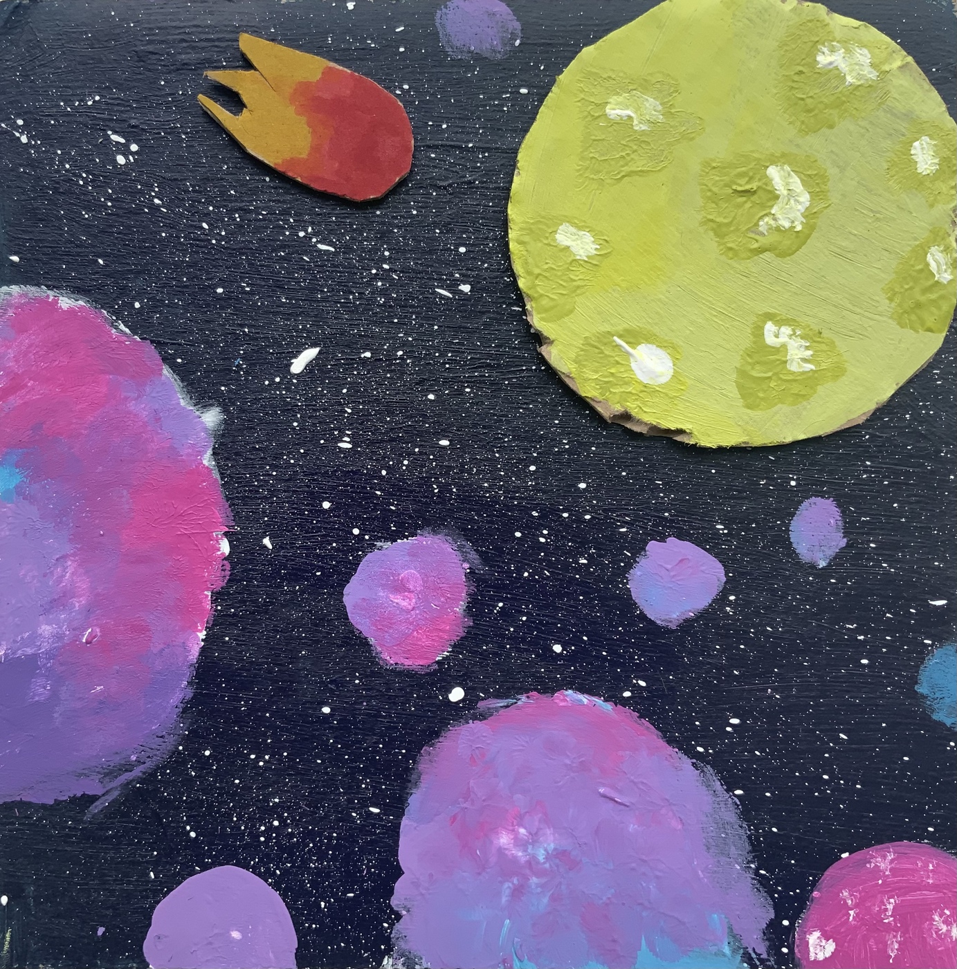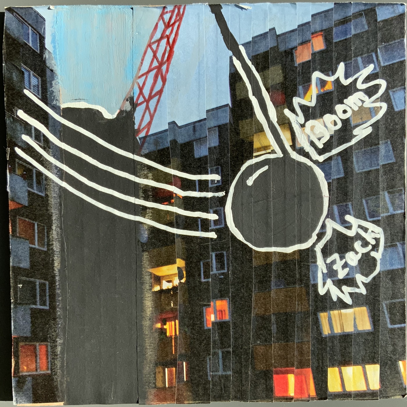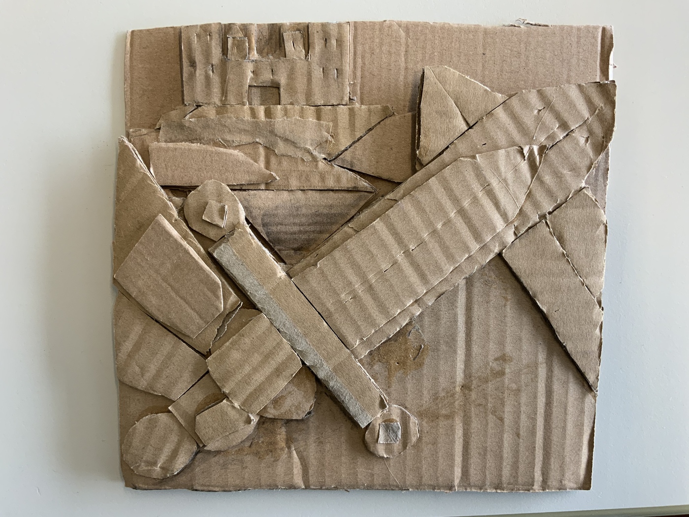 Vielfältig sind auch die Ergebnisse, die zum Ende des Schuljahres im Foyer zu einem Gesamtkunstwerk arrangiert wurden. Und hier begegnen sich nun: Abstrakte Farbflächen, haptische Erlebnisse und figurative Darstellungen, eine große Fülle von Zeichnungen, Comicfiguren, Reliefs, Collagen und Materialbilder mit OP-Masken, Gedichtverse, Sprüche und Musiknoten, Wortsammlungen, mathematische Formeln und sogar ein zerlegter Computer erscheinen auf den Pappquadraten.