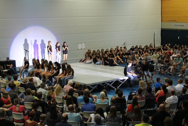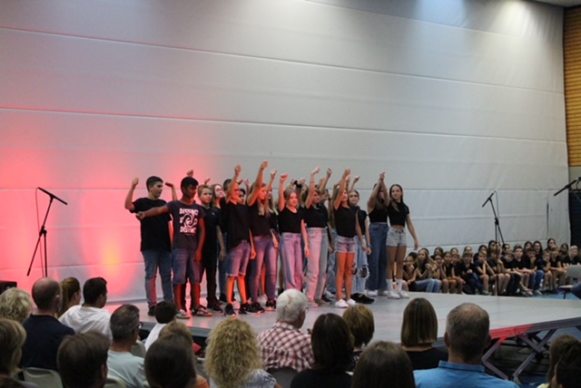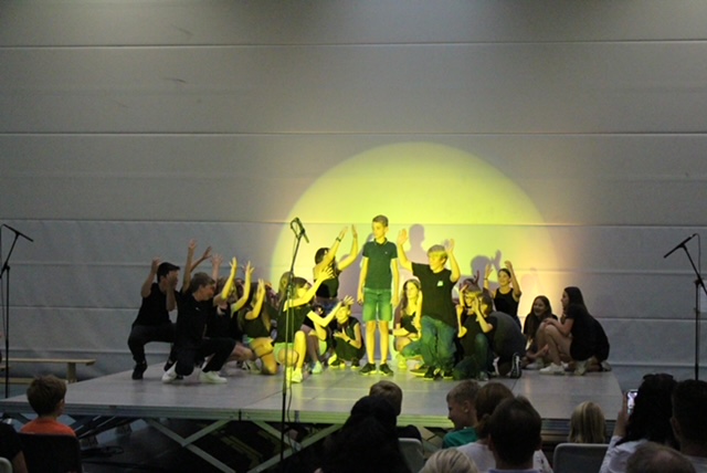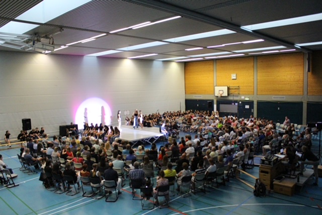 Das Ergebnis „Wackelkontakt“ präsentierten sie gemeinsam vor einem begeisterten Publikum aus Eltern, Freunden und Lehrkräften des Wilhelm-Hausenstein-Gymnasiums. Die eigens dafür aufgebaute, laufstegartige Bühne in der Sporthalle der Schule wurde zur Spielfläche für über 80 Schülerinnen und Schülern.