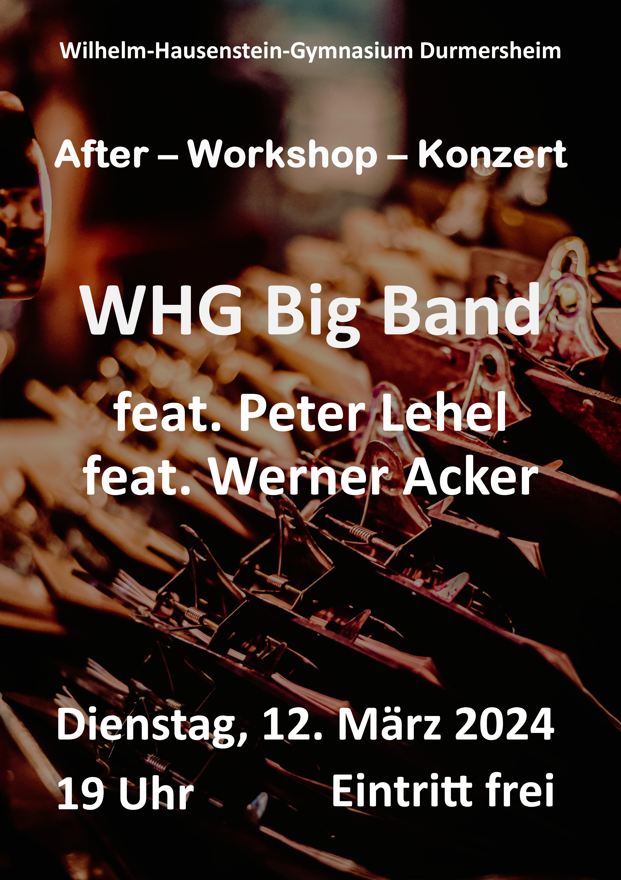 Am Dienstag, 12. März 2024 kommen der renommierte Saxophonist, Komponist und Hochschullehrer Peter Lehel und der international bekannte Jazzgitarrist Werner Acker zu einem Workshop mit der WHG Big Band an das Wilhelm-Hausenstein-Gymnasium Durmersheim. Im anschließenden öffentlichen Konzert werden die Ergebnisse des Workshops präsentiert. Gespannt sein darf man auch auf den Auftritt der beiden Jazzgrößen. Das Konzert beginnt um 19 Uhr, der Eintritt ist frei.