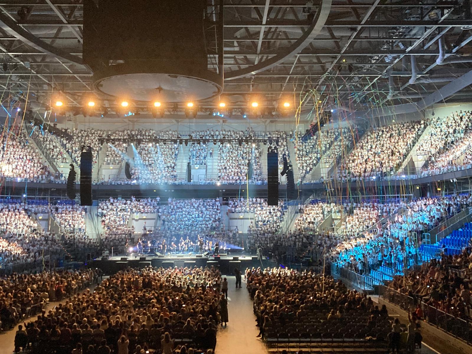 Der Beginn des Konzerts hörte sich so an, als ob die Arena erwachte und dann ertönten Kinderstimmen, die sagten, was für sie wertvoll ist. Danach fingen wir an zu singen und zu tanzen und alle Stücke waren richtig gut eingeübt. Wir sangen passend zu dem Motto „Du bist wertvoll“ unter anderem die Songs „Bleiben wir“ von Wincent Weiß, „Weiße Fahnen“ von Peter Fox, „Wunderfinder“ von Alexa Feser, „Strip“ von Lena, das klassische Stück „Ave Maria“ von Gounod/Bach, das finnische Volkslied „Taivas on sininen“, das deutsche Volkslied „Der Mond ist aufgegangen“ und das kolumbianische Volkslied „San Antonio“.
