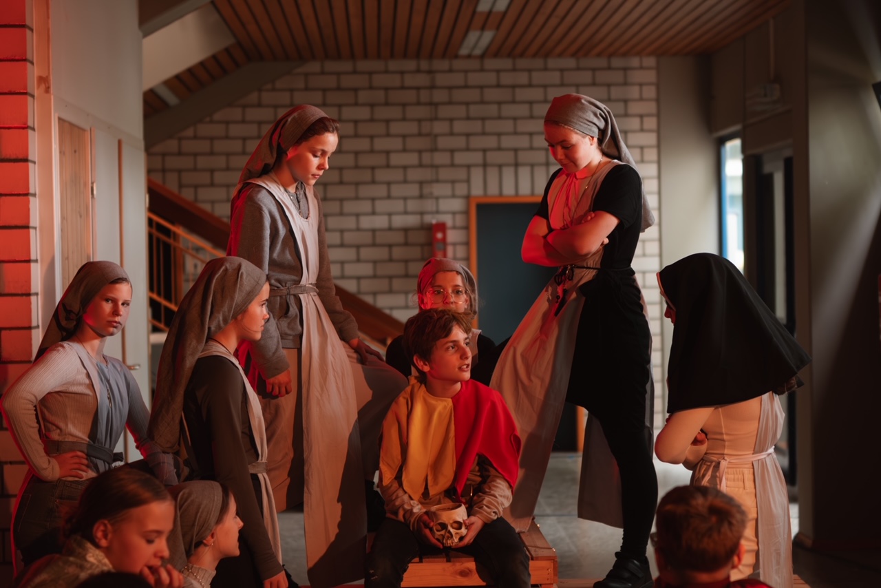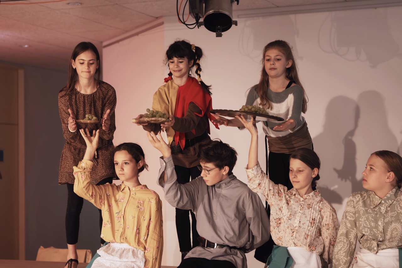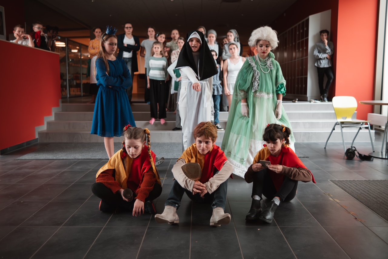 In diesem Sommer konnte man an unserer Schule zum ersten Mal ein Wandertheater erleben. Die Unterstufen-Theater AG hatte sich in diesem Jahr nämlich etwas ganz Besonderes ausgedacht. Unter der Leitung von Frau Scheringer studierten sie verschiedene Episoden rund um Till Eulenspiegel an verschiedenen Orten im Schulhaus ein. Insgesamt gab es drei Szenen, mit jeweils anderen Schauspielern. Alles war prima aufeinander abgestimmt und auch Ton und Technik arbeiteten sehr gut zusammen! Klassische Guckkasten-Bühnen gab es keine, das Ensemble der AG spielte mit den Kulissen, die das Schulhaus bot. Auch für Getränke und Essen war gesorgt. Es hat richtig viel Spaß gemacht, den verschiedenen Szenen, den spannenden Geschichten und den toll kostümierten Schülern zuzuschauen. Falls ihr in der Unterstufe seid und Spaß am Theater spielen habt, dann ist das die richtige AG für euch!