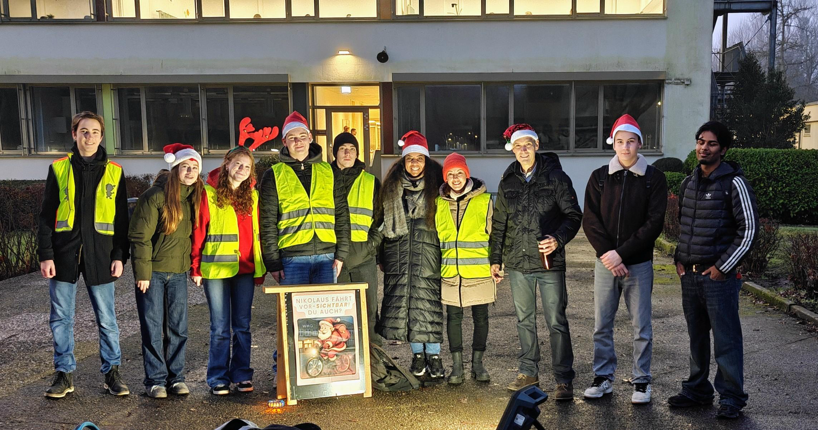 Er saß auf einem Fahrrad und war durch seine intakte Fahrradbeleuchtung gut sichtbar —der Nikolaus. Dies allerdings auf einem Plakat. Diese Darstellung zum Vorbild nehmend, fand am Freitag, den 12. Dezember eine Nikolausaktion am Wilhelm-Hausenstein-Gymnasium statt.