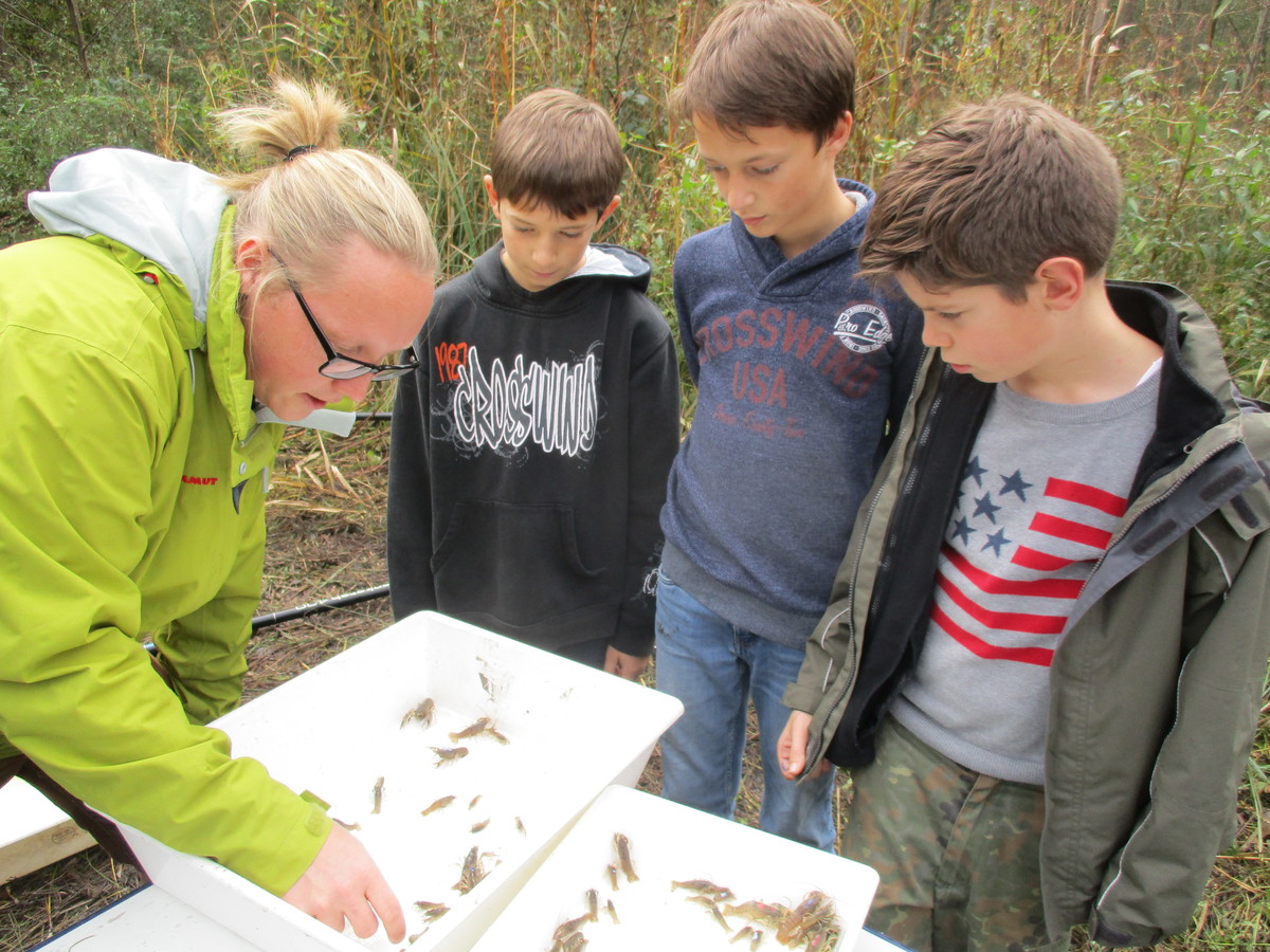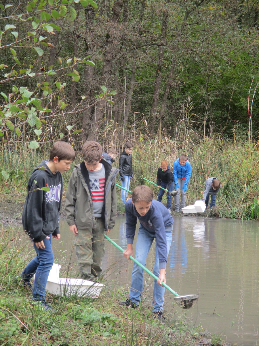 Am 23. Oktober hat sich die Naturschutz AG des WHG Durmersheims unter Leitung von Frau Lang auf den Weg in das Naturschutzgebiet in den Heilwald gemacht. Dort haben wir uns mit den Doktoranden Alexander Herrmann und Andras Stephan von der PH Karlsruhe getroffen. Sie erklärten uns, dass der Kalikokrebs in diesem Gewässer sein Unheil treibt. Der ursprünglich aus Kanada stammende Krebs frisst so ziemlich alles, was in einem Teich lebt. Wir Schüler der Naturschutz AG sind schon echte Profis im Keschern an unserem schuleigenen Federbachteich. Aber in diesem Gewässer haben wir nicht wie sonst Ruderwanzen, Wasserskorpione oder Eintagsfliegenlarven gefunden, sondern lediglich Kalikokrebse in allen Größen, von 1-2 cm bis 15cm groß. Das hat uns sehr erschrocken und nachdenklich gestimmt. Als die Doktoranden von der PH noch erklärten, dass der Krebs auch weite Strecken über Land wandern kann, wurde uns klar, dass sehr viele Gewässer in unserer Region in Gefahr sind. So auch unser schuleigener Federbachteich. Uns wurde klar, dass der Kalikokrebs die Tierwelt in unserer Region nachhaltig verändern wird - nicht zum Besseren!