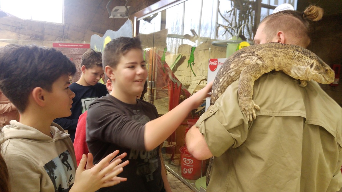 Am Freitag, den 2.02. 2018, besuchten wir, die 6a und 6b des Wilhelm-Hausenstein-Gymnasiums Durmersheim, das Reptilium in Landau. Nachdem wir in der ersten Stunde Unterricht in Biologie gehabt hatten, stiegen wir um 9 Uhr in den Bus und unser Ausflug begann. Unsere beiden Klassen fuhren etwa eine Stunde und kamen um 10 Uhr in Landau an. Nach dem Aussteigen gingen wir in einen großen, sehr warmen Raum, wo wir in Gruppen aufgeteilt wurden. Danach begann die Führung. Zuerst durften wir eine Vogelspinne ansehen und anfassen, was sich nicht alle von uns getrauten.