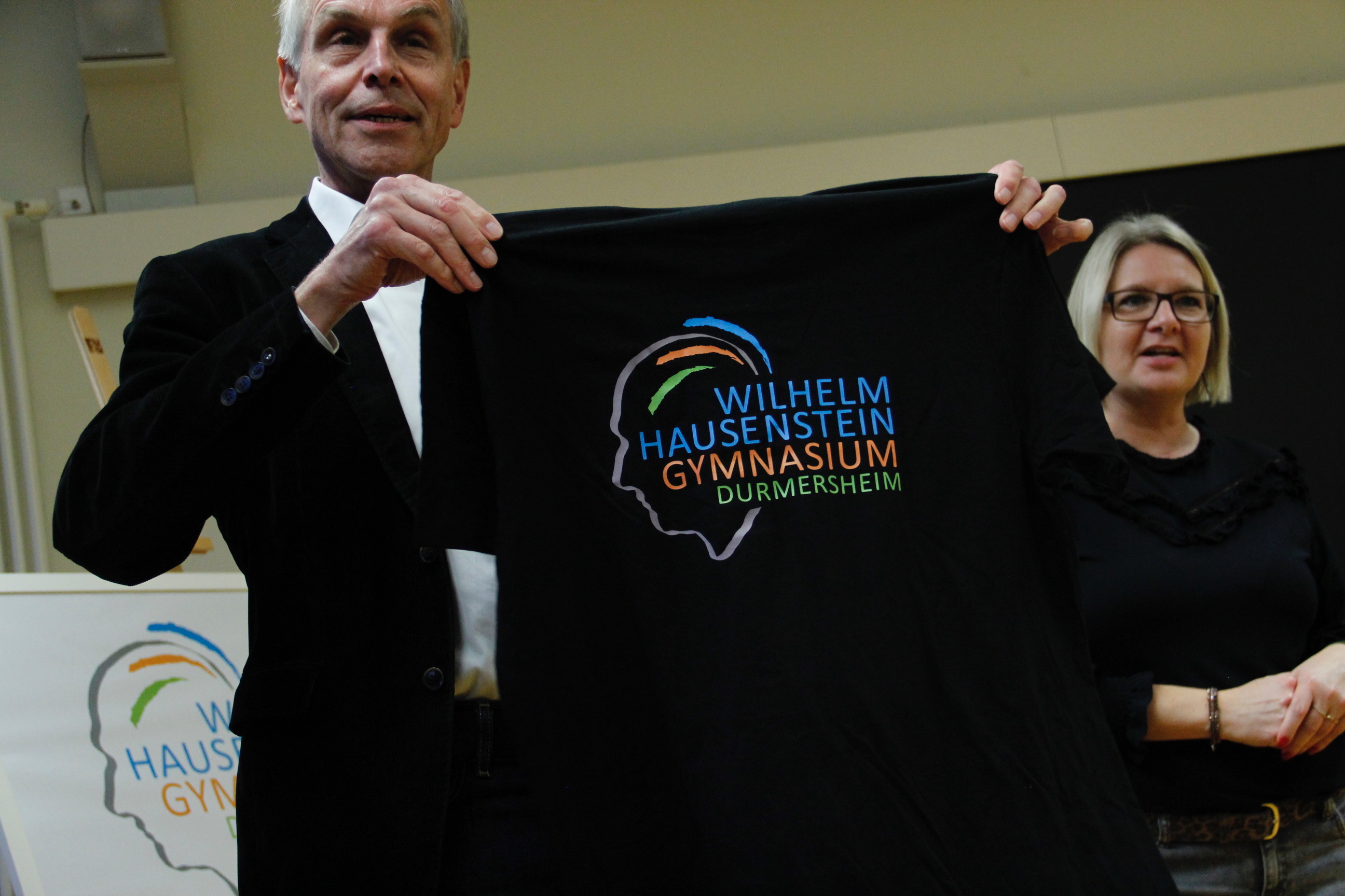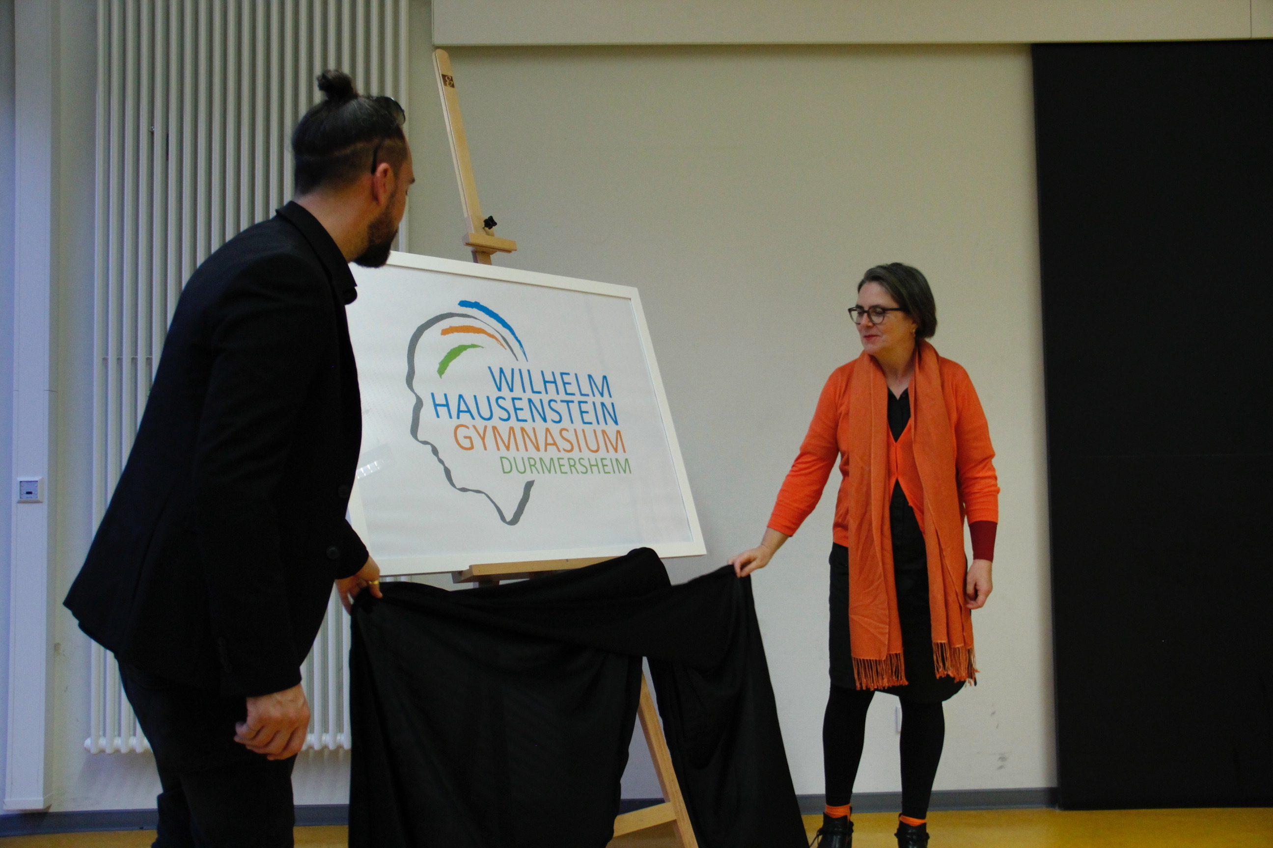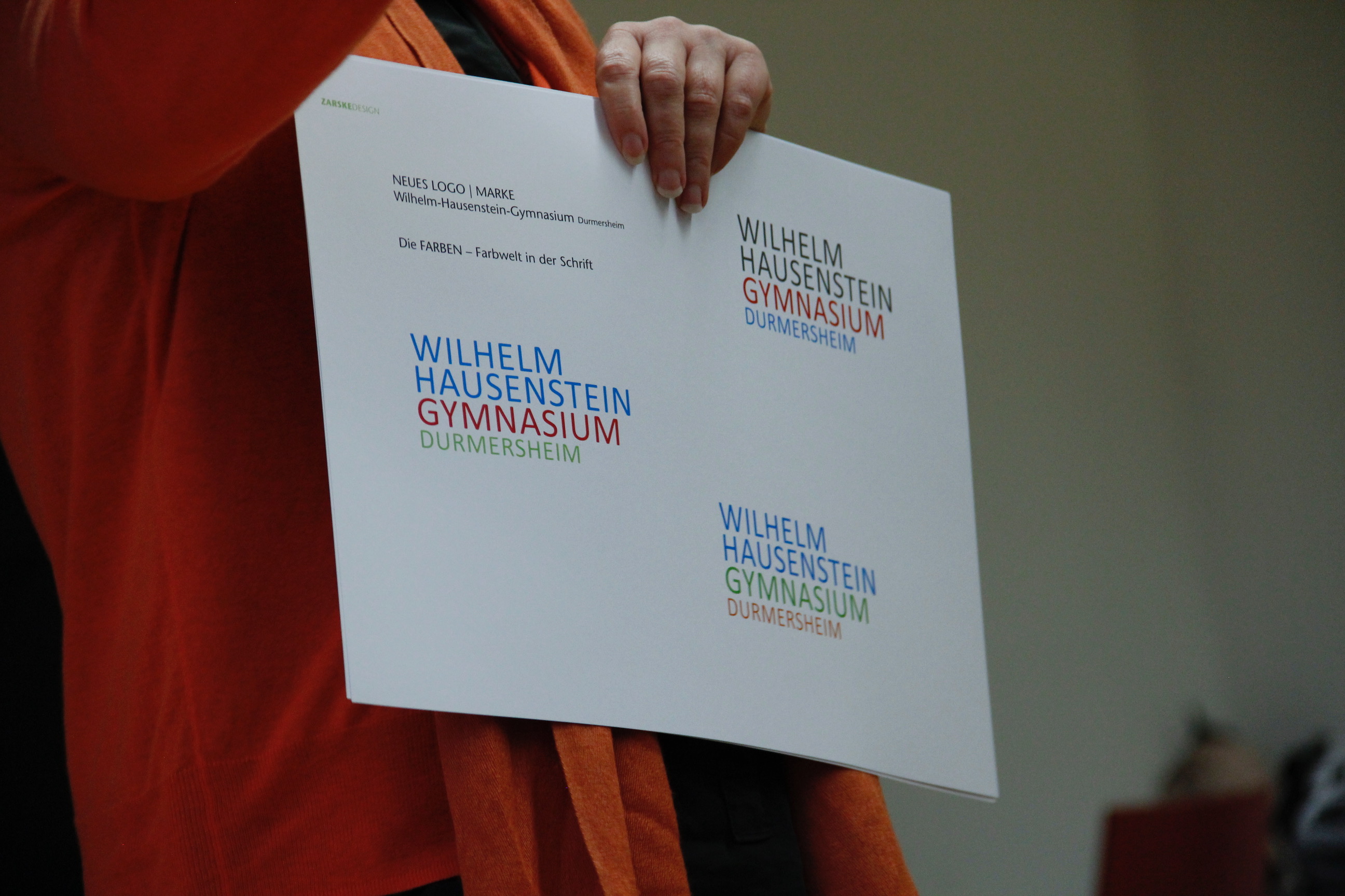 Die beauftragte Designerin Carolin Zarske war anwesend und gab einen spannenden Einblick in die Entstehungsgeschichte des Logos. In den ersten Treffen mit dem Kunstlehrer Hans-Peter Funk und Herrn Dornblüth wurde herausgearbeitet, dass das neue Logo frisch und modern sein, sowie die Individualität der Schüler und die geistige Offenheit der Schule repräsentieren sollte. Zu Anfang gingen viele Ansätze in die unterschiedlichsten Richtungen, damit man sich am Ende für die besten Ideen entscheiden und diese schlussendlich kombinieren konnte. Die Grundideen für das Motiv waren die Silhouette Wilhelm Hausensteins, des Namengebers unserer Schule, sowie eine klare, erkennbare, lockere Schrift und geschwungene Linien in den Farben unserer Schule.