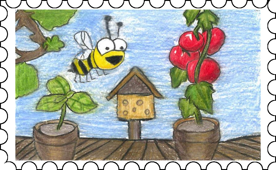Auf meinem Bild ist eine Biene abgebildet. Rechts daneben habe ich eine Tomatenpflanze und auf die linke Seite einen Basilikumtopf gemalt. Hinter der Biene sieht man ein Insektenhotel. Zu dem Bild musste man auch eine passende Beschreibung darüber, wie das Bild entstanden ist und warum der dargestellte Lifehack zum Schutz der Umwelt beiträgt, einreichen. Die Abgabefrist war der 15. Oktober 2021.