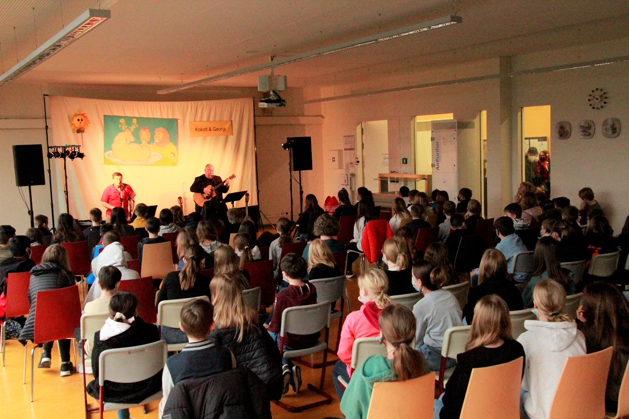 Am 30.03.22 bekamen wir Besuch von dem Künstlerduo Kokott & Georgi, die Balladen aus verschiedenen Epochen vortrugen und uns mit jeder Ballade aufs Neue verzauberten. Mit einzigartigen Instrumenten wie der Zauberflöte (Blaswandler) und einer Mandola war der ganze Raum gefesselt. Passend zu Ostern durfte der „Osterspaziergang“ aus der Tragödie „Faust“ von Goethe natürlich nicht fehlen. Neben dem „Handschuh“ von Friedrich Schiller kam auch die bekannte Ballade „Der Zauberlehrling“ von J. W. v. Goethe in dem 90- minütigen Programm vor. Da die Ballade uns wohl bekannt war, konnte das sogenannte „Zauber-Wort“ von allen mitgesprochen werden. Dankbarkeit und Erleichterung zeigte sich bei den Schülerinnen und Schülern, als eine Leistungsprobe im Anschluss an die Veranstaltung, vorgeschlagen von den Lehrern, durch die beiden Musiker abgelehnt wurde. Ein großes Dankeschön geht an die beiden Künstler, dass sie den weiten Weg aus dem fernen Berlin auf sich genommen haben, um den 6. und 7. Klassen eine unvergessliche Darbietung über Balladen und Fabeln zu bescheren. Ein anderes großes Dankeschön geht an Frau Bolle, die beide Auftritte organisiert und das künstlerische und kulturelle Leben nach 2 Jahren Corona- Zwangspause wieder an unser WHG zurückgeholt hat.