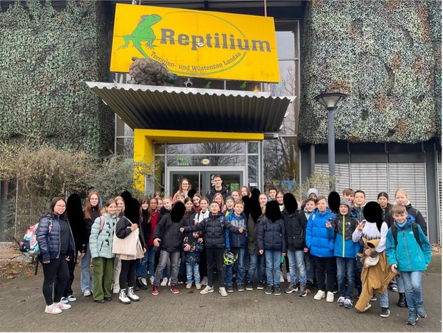 Am Freitag dem 10.03.2023 waren wir, die Klasse 6d und die Klasse 6c, zu Besuch im Reptilium in Landau. Nach einer Stunde Fahrt kamen wir in Landau an und hatten noch Zeit, um etwas zu essen und ein paar Spiele auf dem Parkplatz zu spielen. Natürlich Spiele über Reptilien – passend zum Reptilium. Nach einem kurzen Rundgang begann auch schon unsere Führung. Jede Klasse hatte ihren eigenen Guide, der uns durch das Reptilium führte. Er informierte uns über die verschiedenen Tiere und ihre jeweiligen Besonderheiten. Besonders gefallen hat uns allen, dass wir drei Tiere anfassen durften. Nämlich eine Schlange, eine Bartagame und eine Schildkröte. Nach der Führung hatten wir nochmals Zeit, uns die Tiere genauer anzuschauen und zu beobachten. Nach einem gemeinsamen Mittagessen sind wir dann gegen 12.30 Uhr zurückgefahren. Der Ausflug war sehr schön und cool.