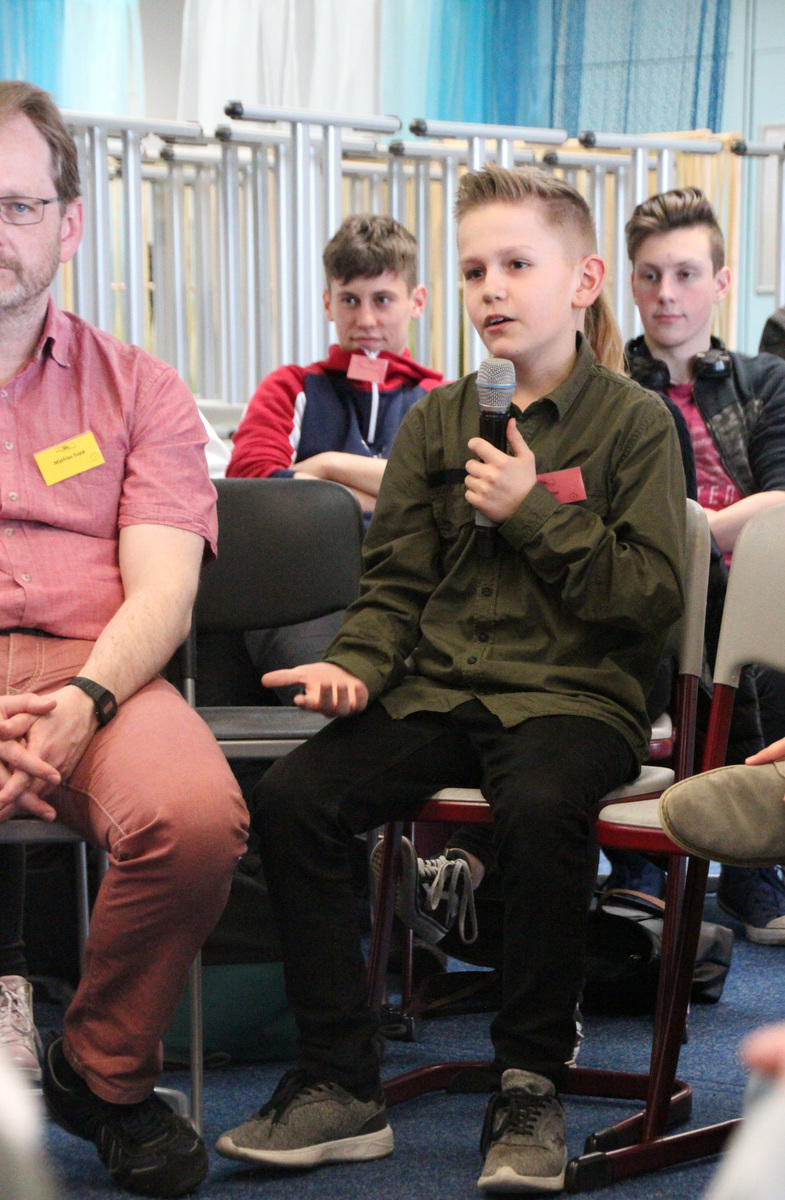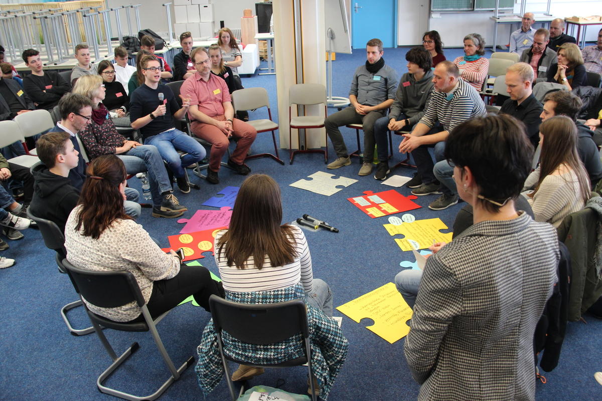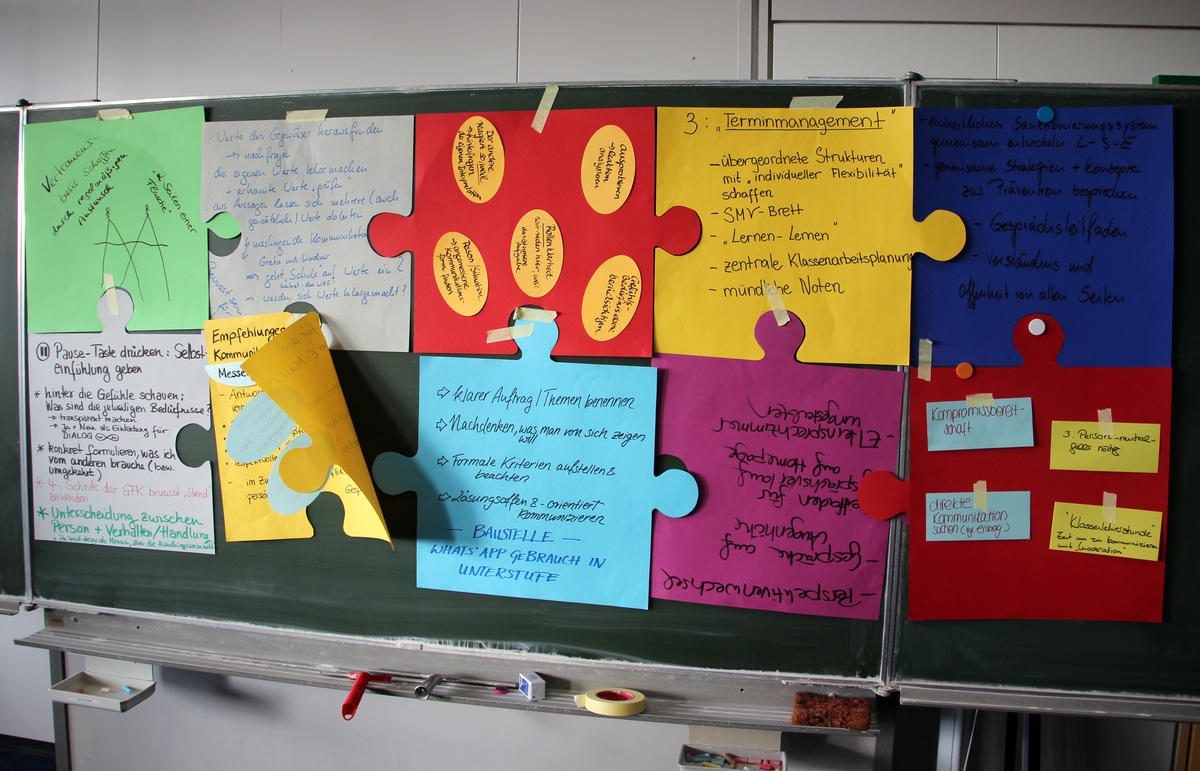 Am Nachmittag wurden ebenjene Puzzleteile zu einem großen Bild zusammengefügt, indem die Gruppen in einer großen Gruppendiskussion ihre Erkenntnisse zusammentrugen. Zu Beginn wurde von den Moderatoren sowohl die gute Atmosphäre in den einzelnen Gruppen als auch die bereichernde Zusammensetzung von Schülern, Eltern und Lehrern gelobt. Daraufhin trugen einzelne Vertreter der Gruppen ihre Wünsche, Erlebnisse und Erkenntnisse im Umgang mit Konflikten und in der Führung eines Gesprächs, der Koordination von Terminen oder auch der Kommunikation über digitale Medien vor. Das Spektrum reichte von Leitfäden für eine geregeltere Kommunikation bei Gesprächen, der Wichtigkeit von Fairness und Klarheit in der Kommunikation wie etwa durch einen gelingenden Perspektivenwechsel und Schritten zur Konfliktlösung bis zu Erwartungen an das Gegenüber in der digitalen Kommunikation.