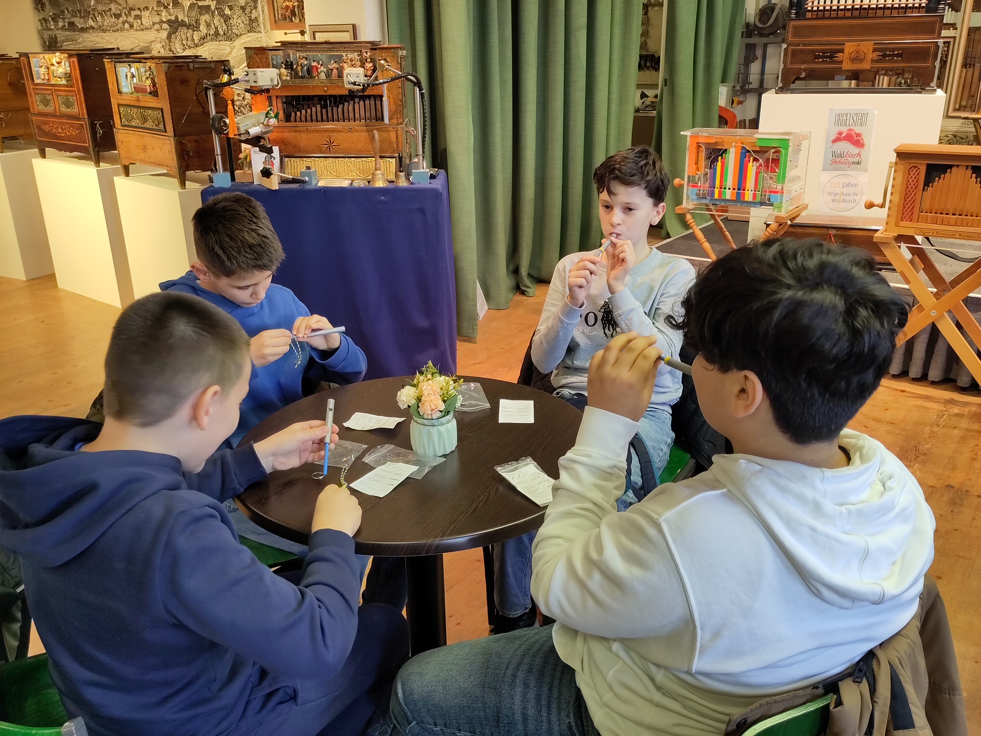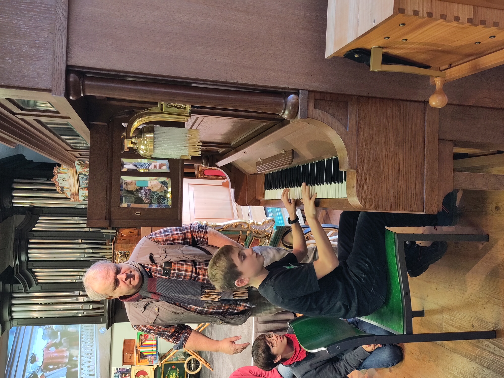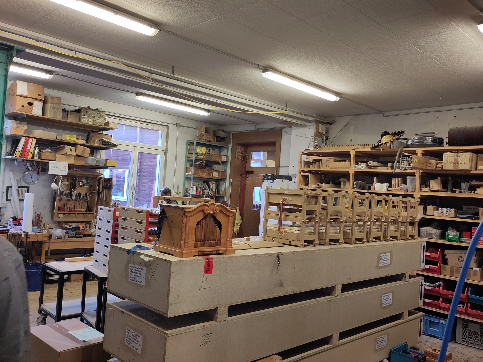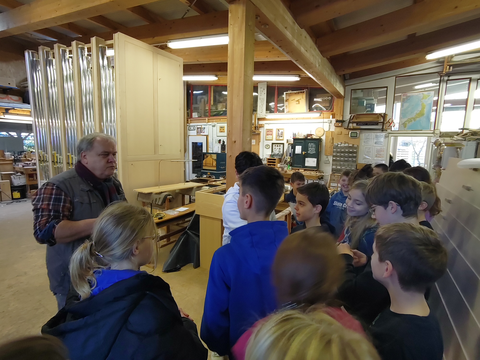 Dort angekommen, wurden wir auch schon herzlich von Herrn Brommer begrüßt. Er erzählte uns viel über die Geschichte seiner Familie und den Orgelbau. Es gibt viele verschiedene Orgeln - Drehorgeln, Spielorgeln und Pfeifenorgeln. Am meisten wurde uns über die Drehorgel erklärt. Diese war früher zur Unterhaltung der Menschen da. Heute sieht man sie meist nur noch in Museen. Aber wir bestaunten auch eine riesige Pfeifenorgel, die in der Werkstatt gebaut wurde, um nach Korea verschickt zu werden. Dort brauchen die Orgelbauer ganze vier Wochen, bis die Orgel wieder aufgebaut ist. Zum Schluss der Führung bekamen wir alle noch eine Miniorgelpfeife geschenkt, mit der wir unsere Eltern morgens um 6 Uhr wecken sollen.